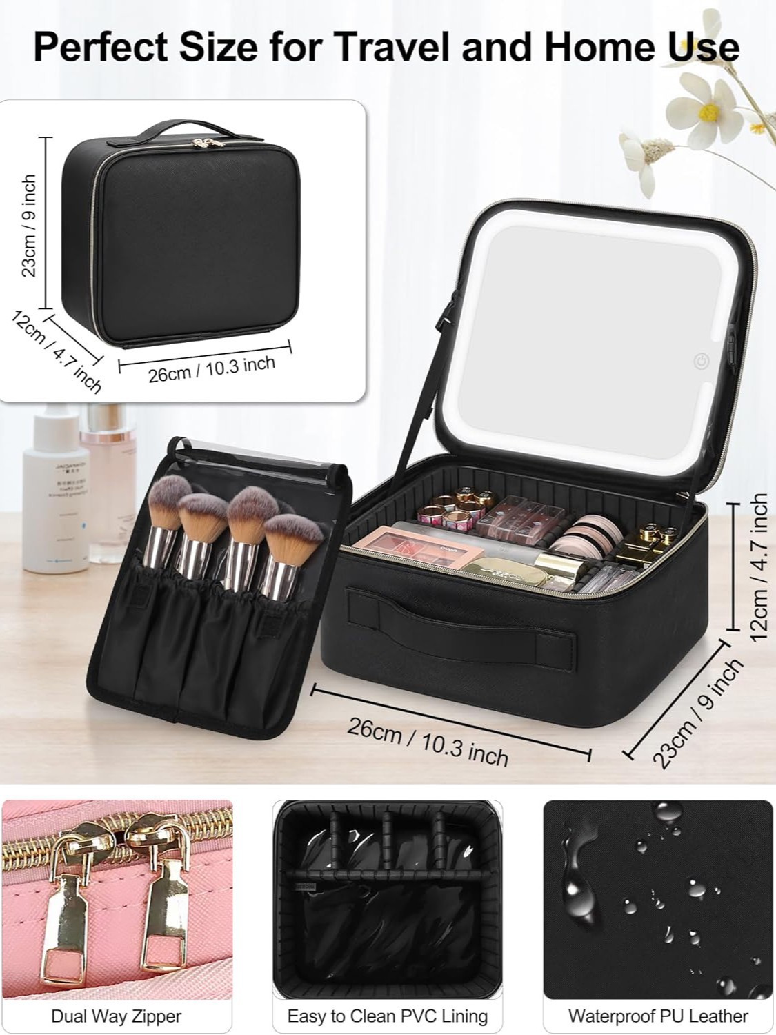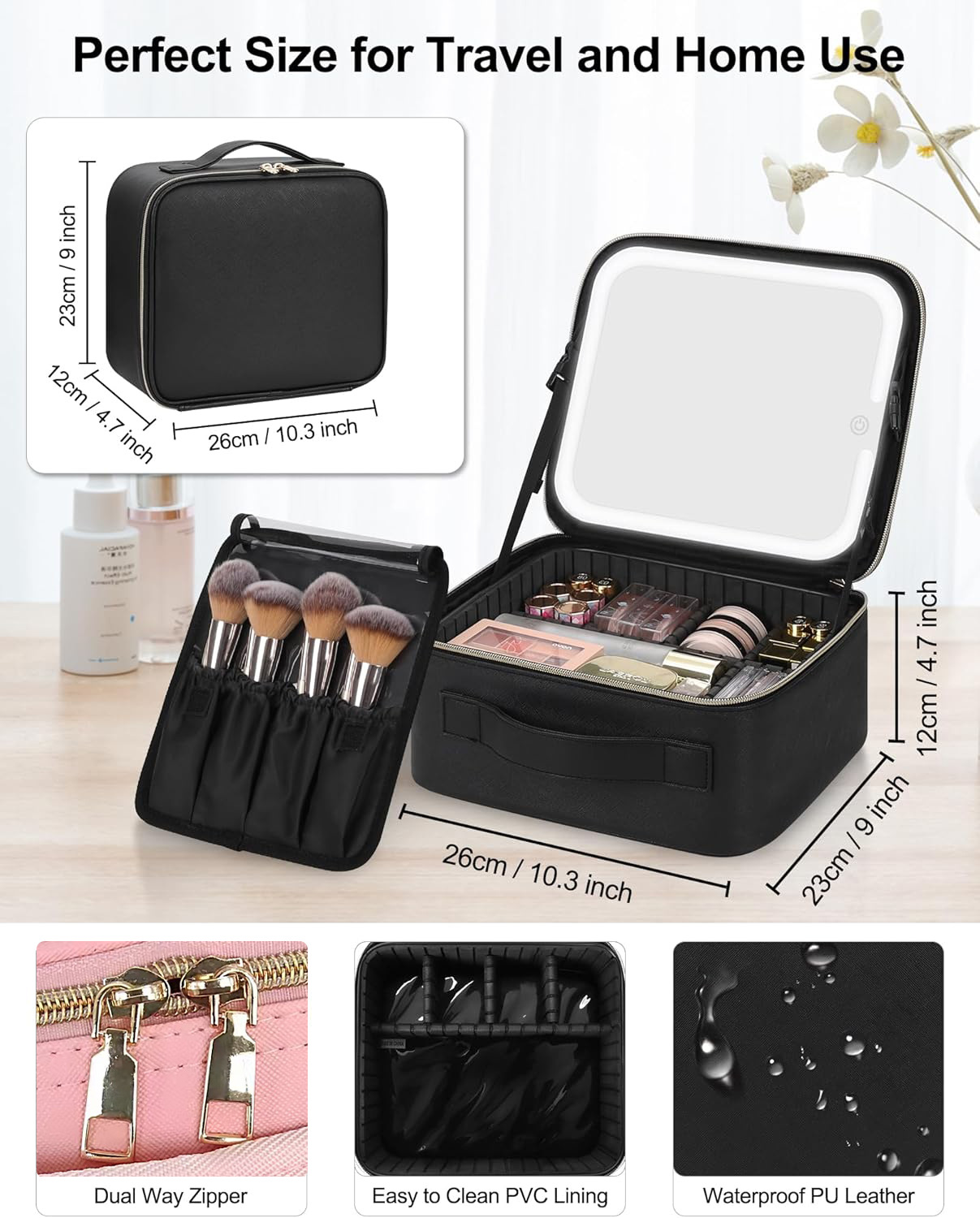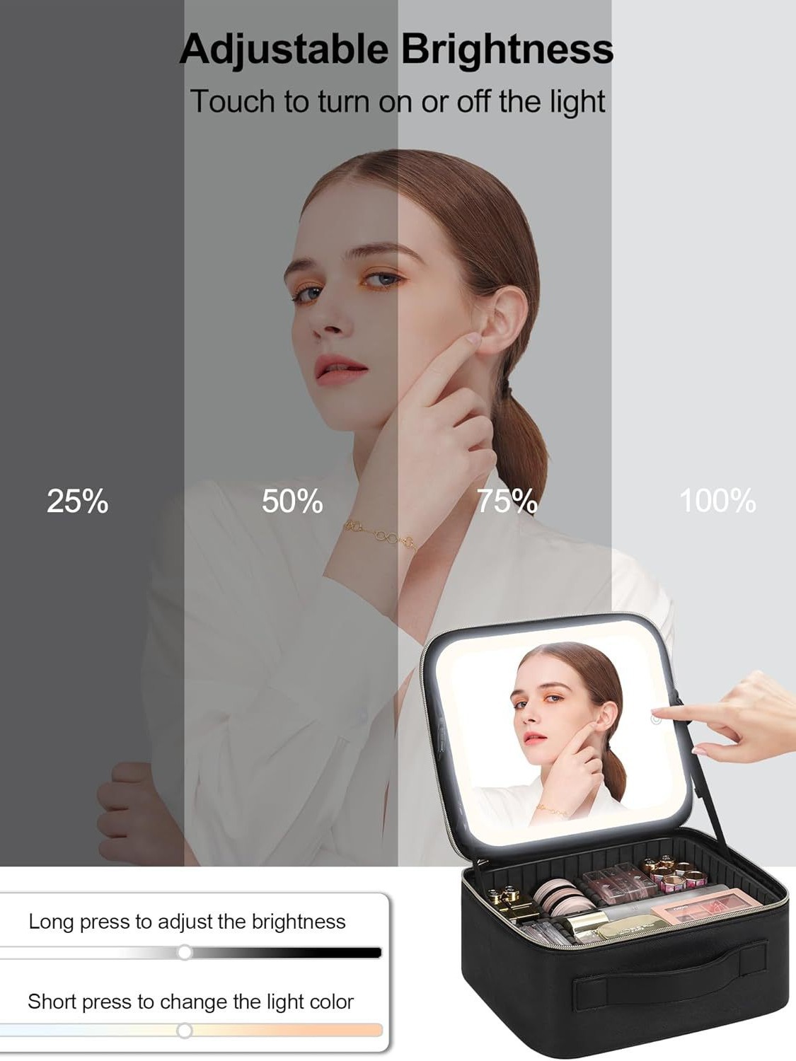 This case features a built-in makeup mirror with adjustable LED lighting in three tones: cool white, warm yellow, and a balanced mix. With customizable brightness and a rechargeable power source, it’s ideal for makeup application in low-light environments—perfect for travel, events, or on-the-go touch-ups.